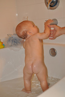 Right behind "Mama" and "Dada" your first word was ball or "BA". We got you a big rubber blue ball and you love to chase it around the house, pushing it along as you crawl. Your Dad is thrilled that you are now able to play catch with the ball. We are still working on your aim and your technique but we're convinced you have a real future. In the beginning when you were still a little unsteady sitting up on your own, you would pick the ball with your feet and then bring it up to your hands. You continue to use your feet as another set of hands which makes me laugh.